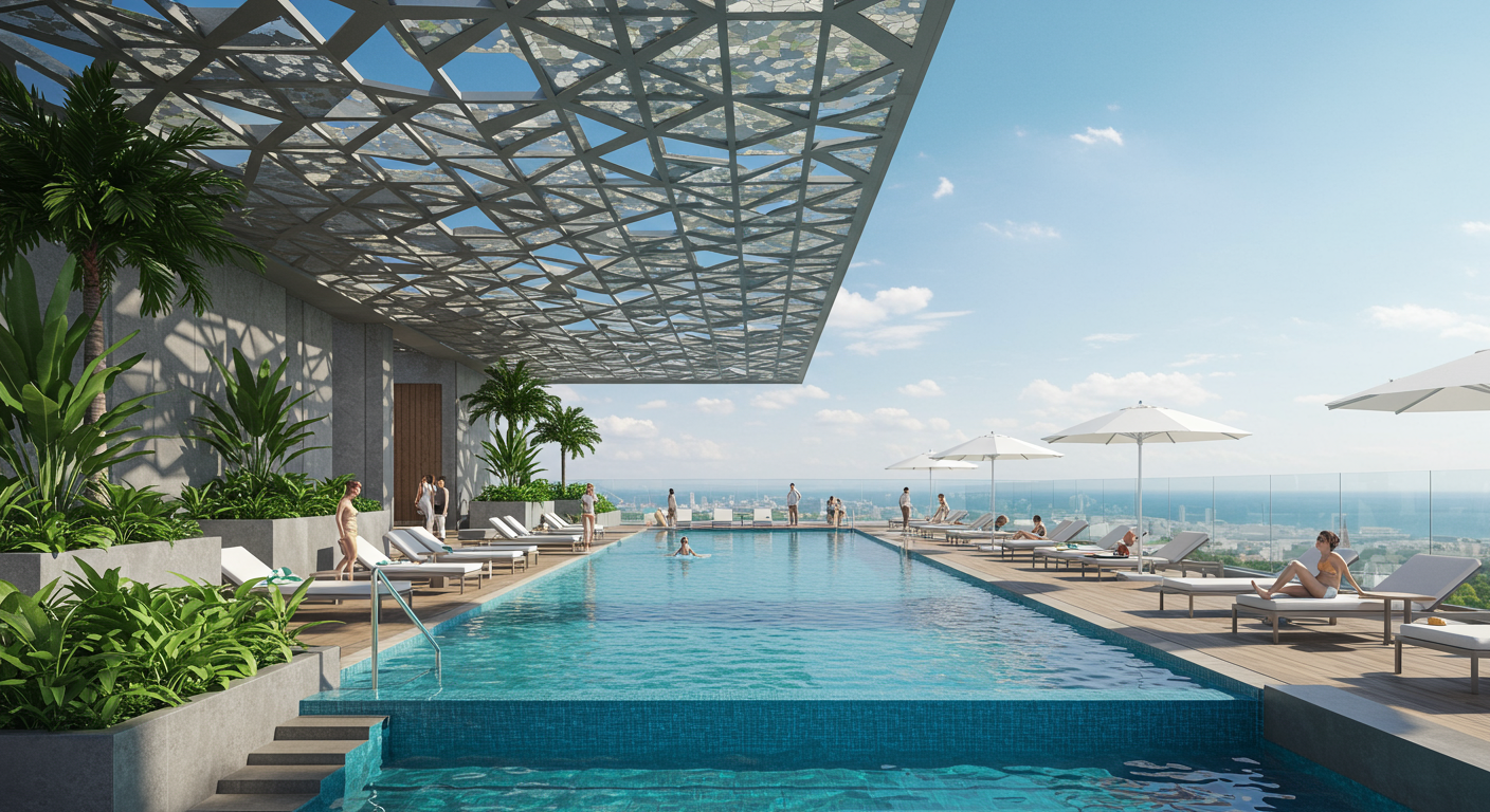 Residents can expect an array of amenities and services, with over 130,000 square feet of amenity and hospitality space. This includes a 174-key hotel, retail outlets, on-site parking, and innovative mobility solutions like electric vehicle charging stations and a car fleet.