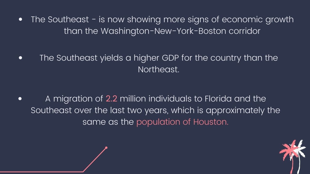 The southern states, by eliminating their restrictions quicker, were able to attract people from the north east who were anxious about the stringent virus regulations. Plus, South Florida and the Southeast economic system favors business growth and job opportunities.