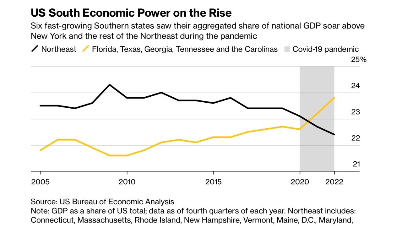 According to Bloomberg and the $100 Billion Wealth Migration Tilts US' Economy to the South article, the Southeast is currently experiencing a significant economic shift resulting in a wealth migration worth $100 billion. Additionally, the Southeast has emerged as a hub for job growth, accounting for two-thirds of all job growth since the beginning of 2020. In contrast, the Northeast has suffered losses totaling around $60 billion, as per data from the Internal Revenue Service.