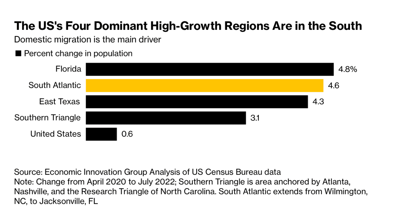 Mark Vitner, an economic consultant for Piedmont Crescent Capital, pointed out to Bloomberg that any random dart thrown at a map of the South would hit an area that is rapidly growing.