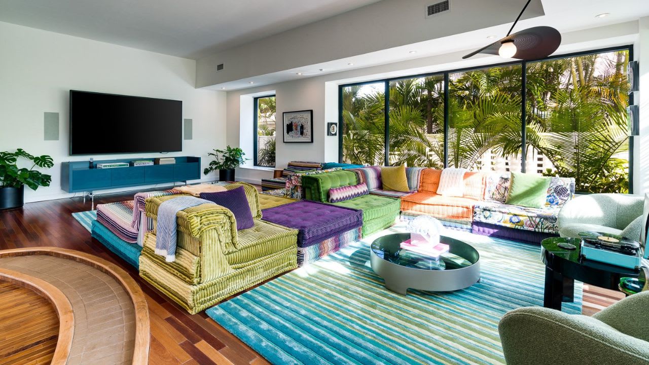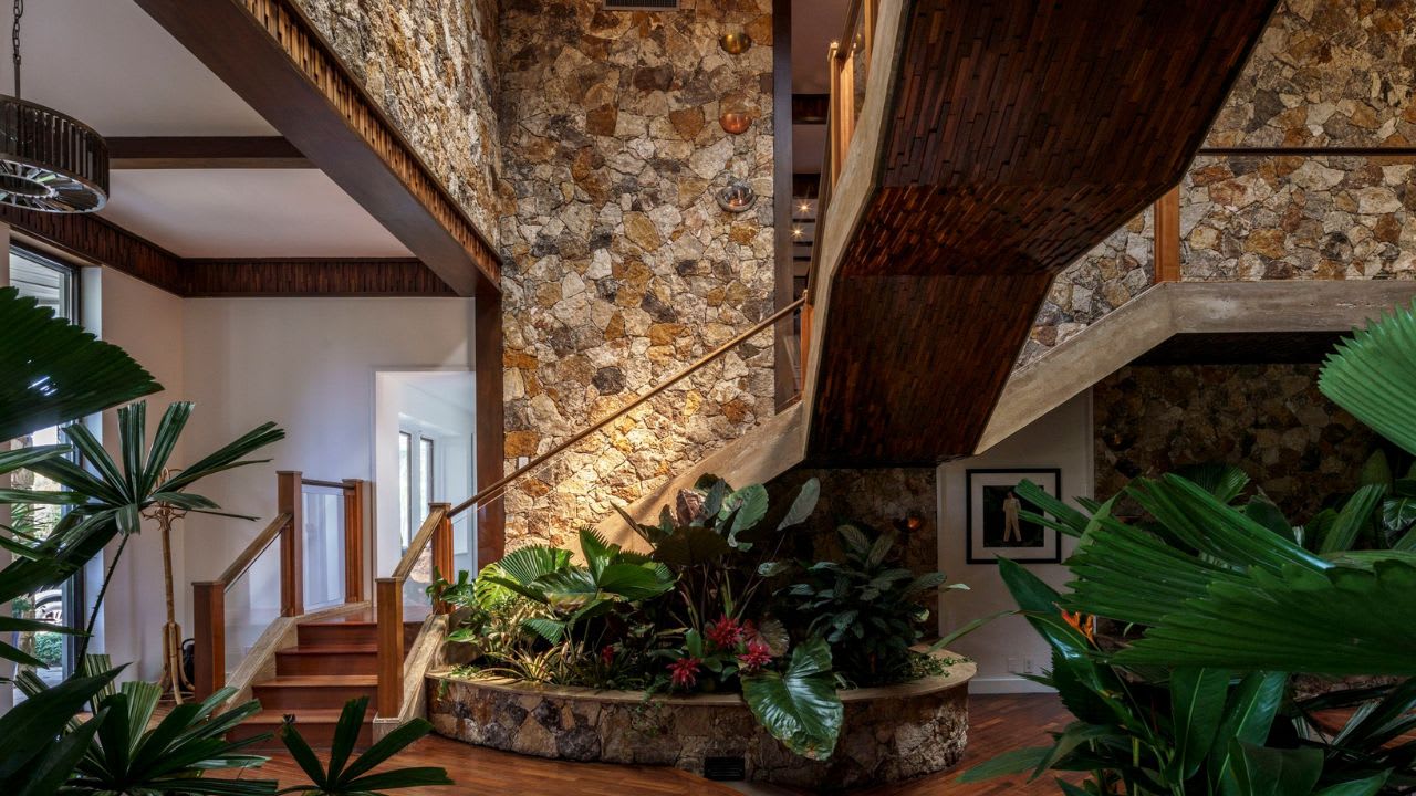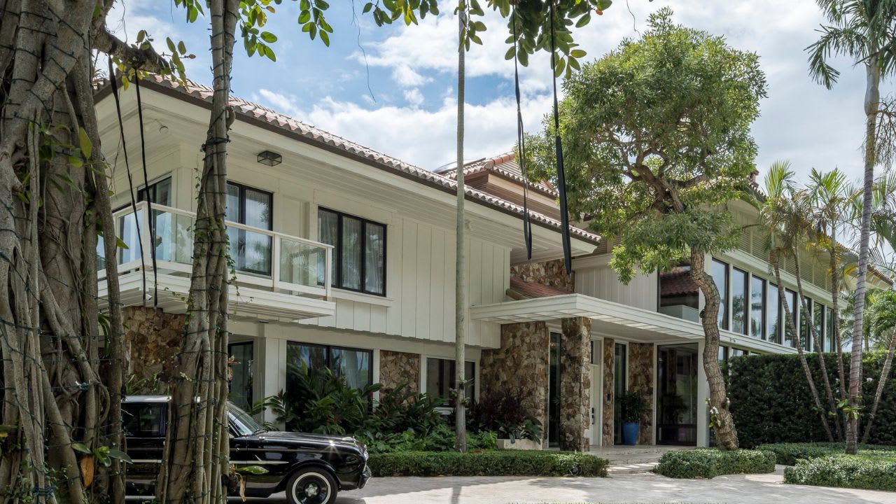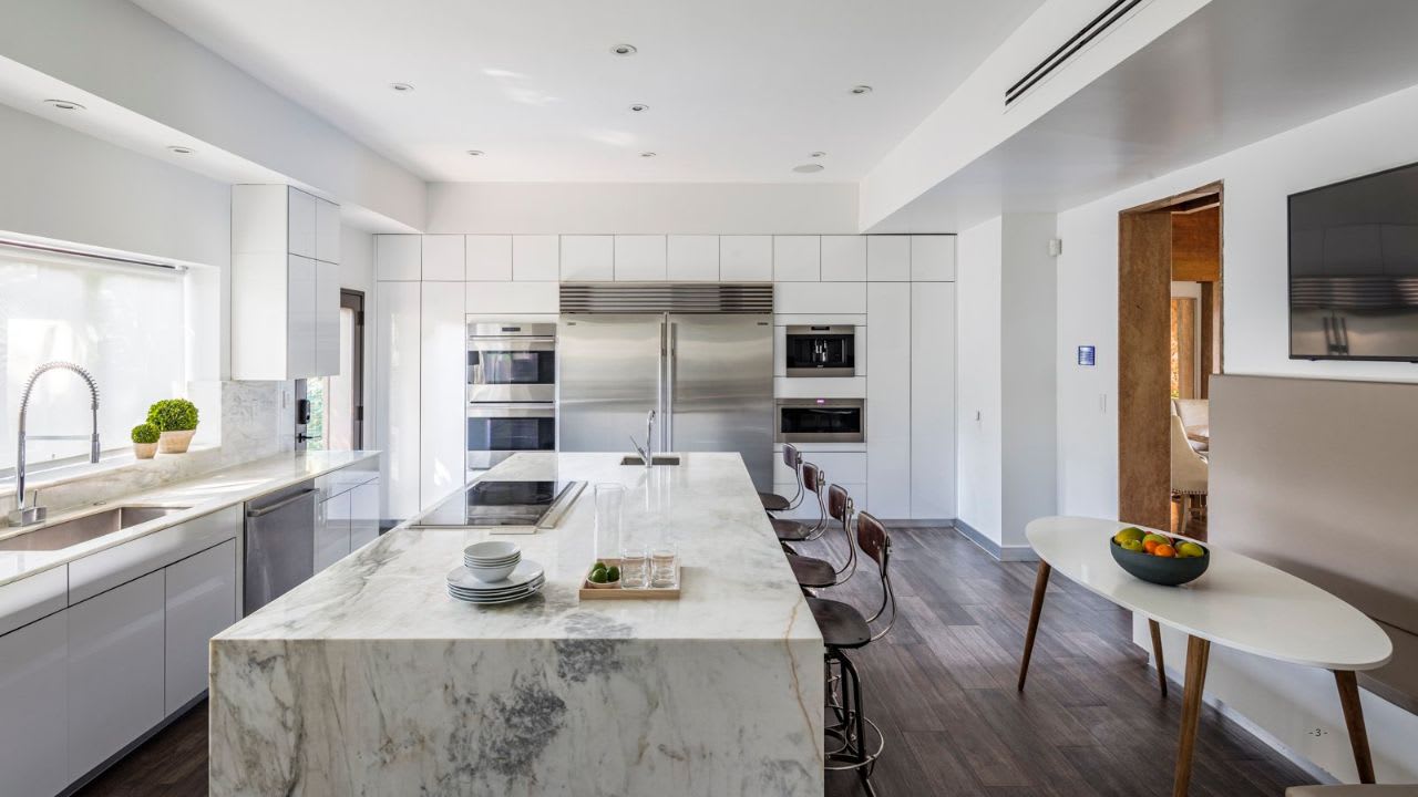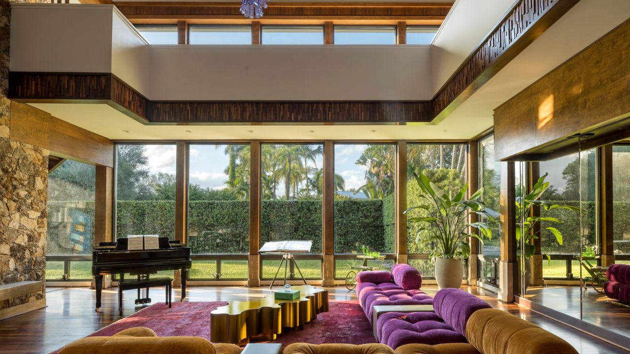 The celebrity couple enlisted the services of interior designer to revamp the residence after acquiring it just last year for a sum of $11 million. Situated within the highly sought-after guard-gated community of Bay Point, this waterfront architectural gem draws inspiration from Frank Lloyd Wright's iconic style and boasts an impressive total area spanning 10,414 square feet on a generously sized lot measuring 15,599 square feet. With six bedrooms and nine bathrooms at its disposal, this dwelling impresses with soaring 30-foot high ceilings adorned with walls crafted from elegant stone materials.