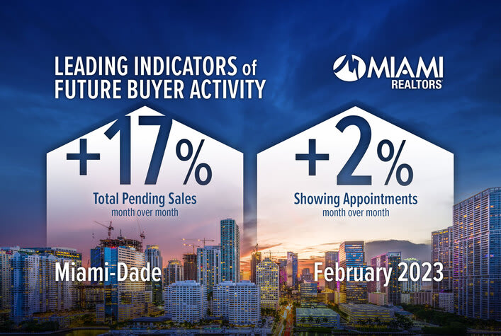 MIAMI — Miami-Dade $1-million-and-up transactions surged triple digits versus pre-pandemic 2019 transactions as total pending home sales and showing appointments rose again for the second consecutive month, according to February 2023 statistics released today by the MIAMI Association of Realtors (MIAMI) and the Multiple Listing Service (MLS) system.