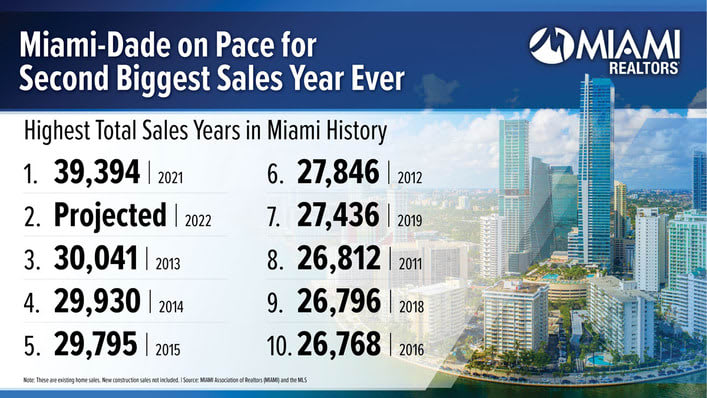 The Miami-Dade County real estate market has already sold 25,990 total homes sales (or 95 transactions per day) through September 2022, putting it on pace to be the second-best year ever for total annual sales behind historic 2021.