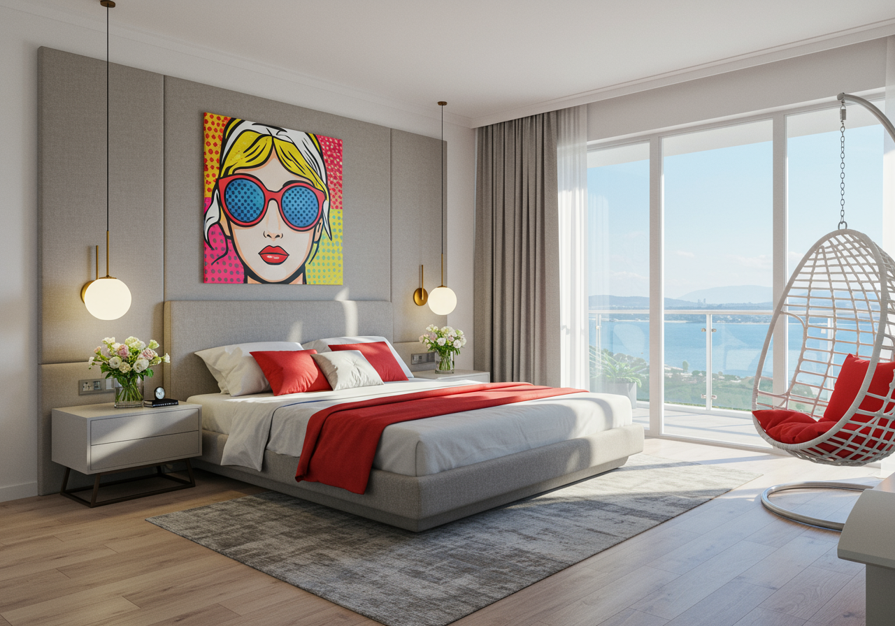 The master bedroom has views of the 60-foot-long infinity pool, waterfront, pool-side cabana and jet ski dock.