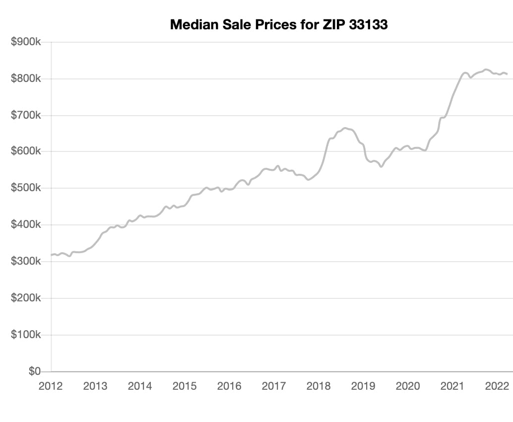 The median price for Coconut Grove has increased to $800,000s, almost double than the median price for Miami-Dade.
