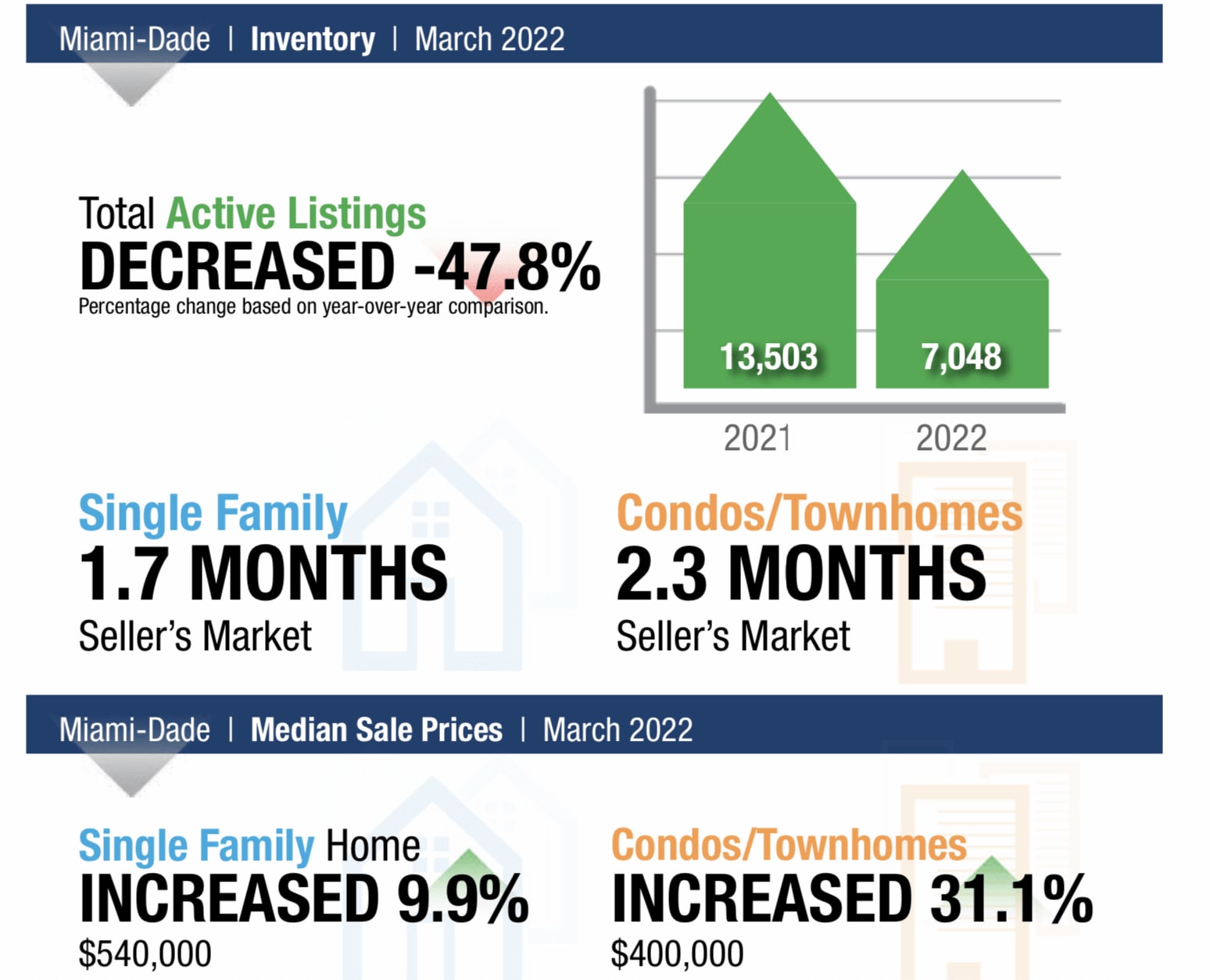 For the month of March 2022, there was a whopping 47.% decrease from March 2021 in active listings. There were over 13,000 properties listed for sale in March of last year and only 7,000 on March 2022. Median prices have also increased for Miami-Dade - by 9.9% for single-family homes, and 31% for condos/townhomes.