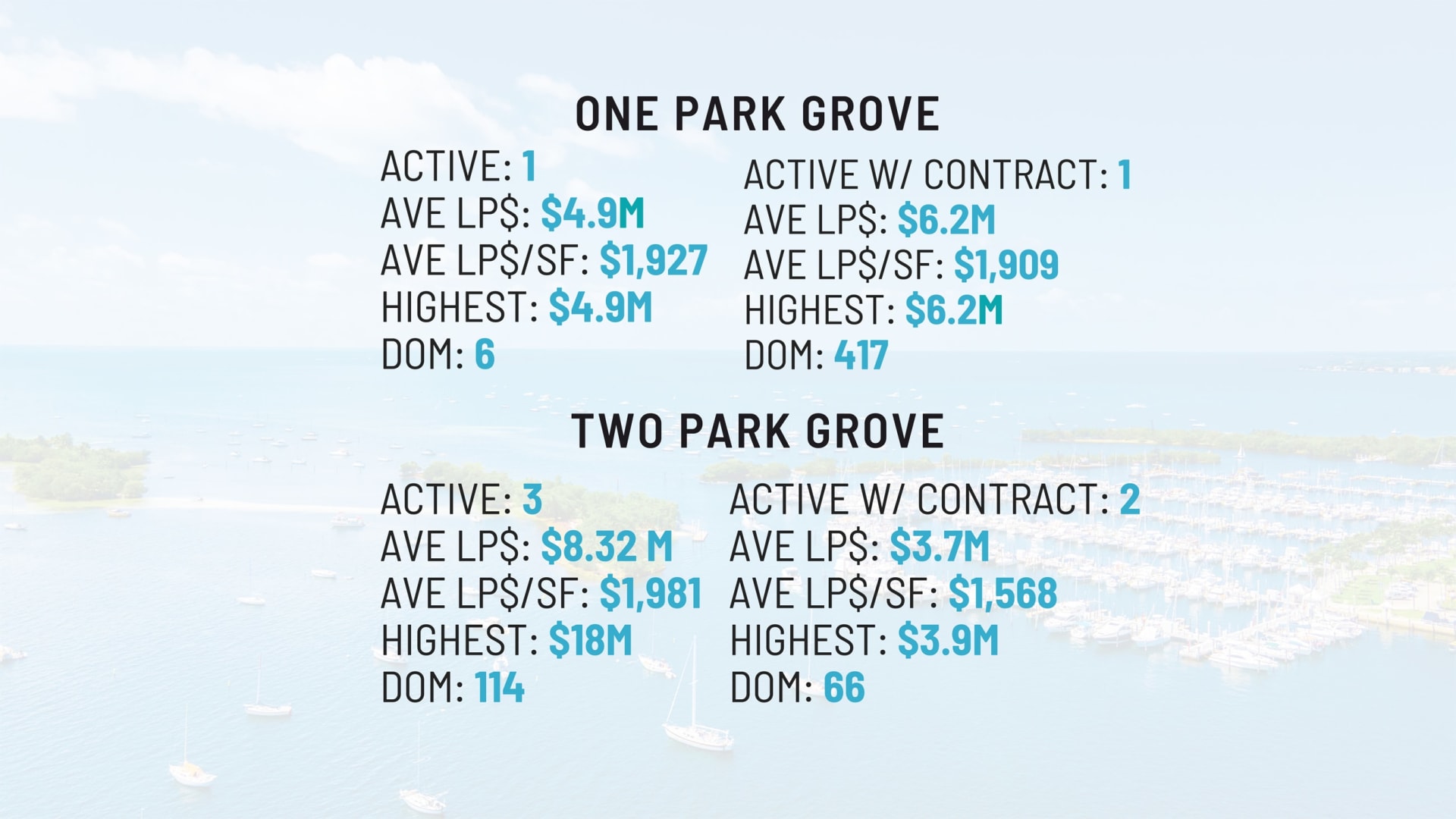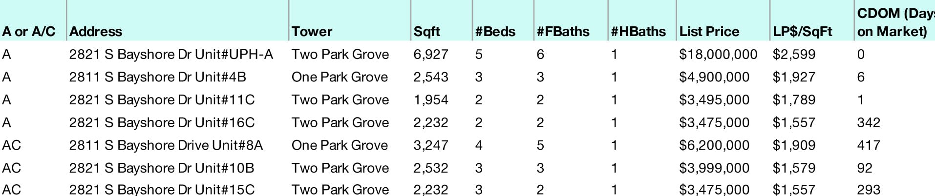 One Park Grove, the last tower of Park Grove, was delivered during the height of Covid. Since it was delivered in May 2020, it has been really hard to find inventory for sale or even rent in the One Park Grove 2811 S Bayshore Dr. building. One Park Grove real estate enjoys high demand with scanty if not zero options. Since late last year, it has been virtually impossible to find a residence in One Park Grove for sale or rent and one that has traded for that matter.