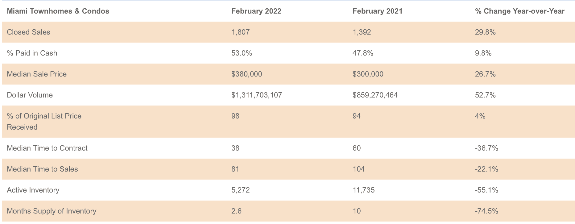 Check the Miami Real Time Market Stats March 2022 vs March 2021 stats for condos/townhomes brought to you by Miami Realtors and Trendgraphix.