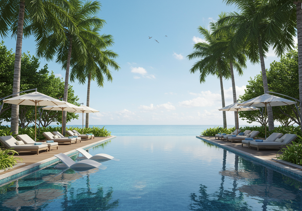 - Beachside swimming pool and outdoor spa with sunbeds and cabanas