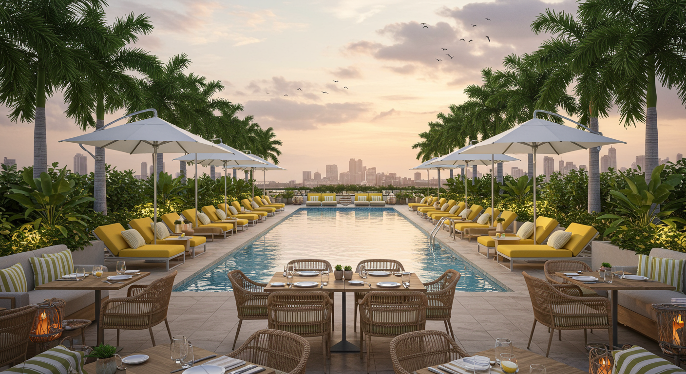 - Global-inspired rooftop restaurant and bar with poolside service and on-demand delivery to residences