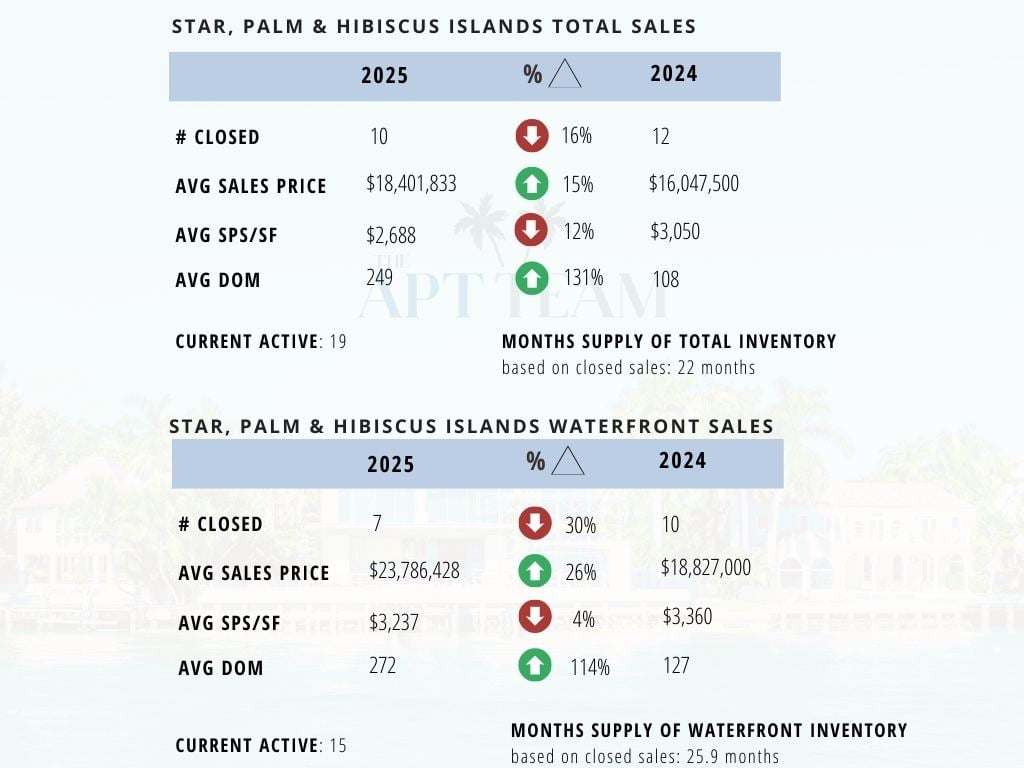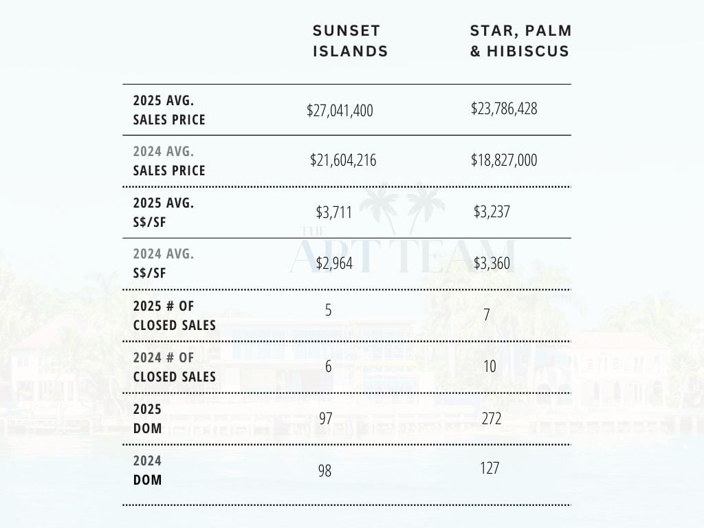 - Waterfront homes set new benchmarks. Sunset Island waterfront sales showed roughly 25% increases in both price and price per square foot, while days on market remained stable. Star, Palm and Hibiscus waterfront homes also increased by 25%.