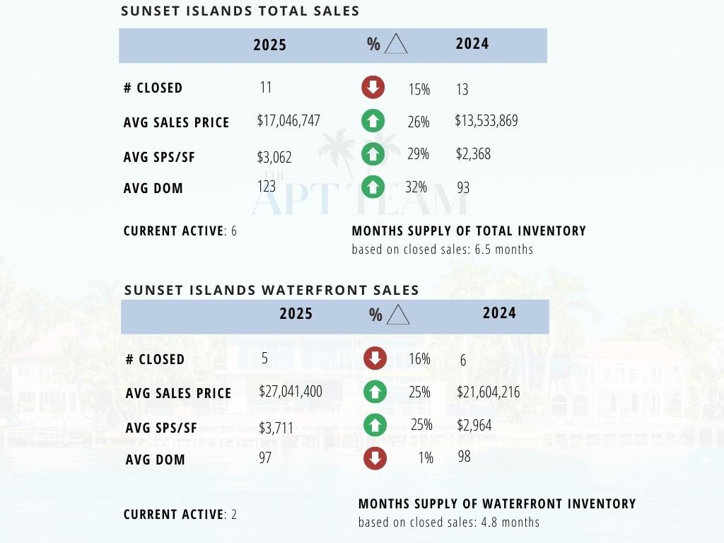 - Average prices rose by ~15–30%, even as sales volume moderated. Average sale prices and price per square foot increased meaningfully—especially on Sunset Islands—signaling strength driven by quality and scarcity, not excess demand.